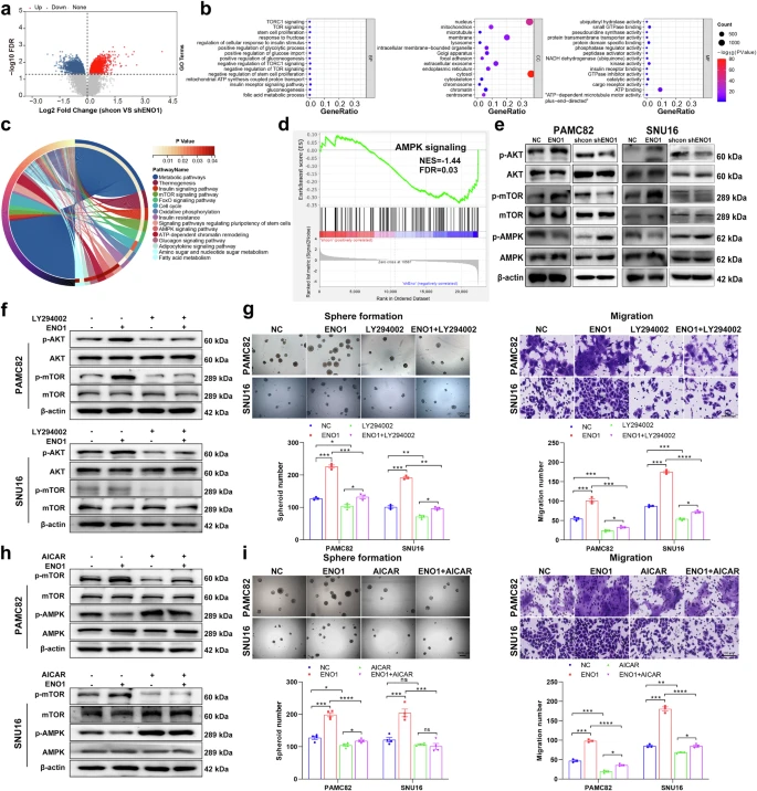 作者对对照组和ENO1敲低组进行了RNA-Seq分析,结果显示:敲低组细胞中共有2116个基因上调、1845个基因下调(图2a);KEGG 和GO分析显示:差异表达基因(DEGs)主要富集于代谢通路,如糖酵解过程的正调控和AMPK/mTOR信号(图2b、c);GSEA分析进一步显示ENO1可能介导AMPK/mTOR通路(图2d)。