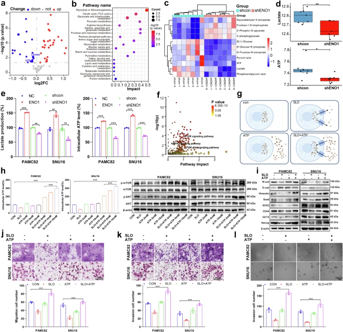 由于PI3K/AKT和AMPK/mTOR信号通路是经典的能量代谢相关通路,接下来作者分析了TCGA数据库中的肿瘤样本,发现高表达ENO1的患者呈现更高的糖酵解相关评分(补充图6a)。结合补充图6b的数据,作者对临床胃癌样本的TCGA和RNA-Seq结果分析一致显示ENO1影响两种关键糖酵解产物——ATP和乳酸的水平。