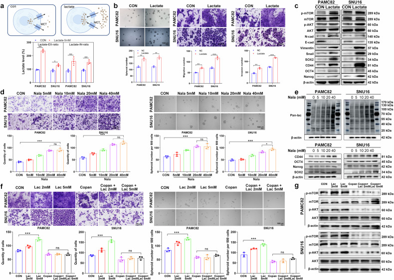 作者进一步探讨了乳酸对PI3K/AKT通路的影响,发现乳酸促进PI3K/AKT通路激活。当乳酸与PI3K抑制剂COPAN共给药时,其相关的迁移和球形成增强(图4f)以及PI3K/AKT通路激活(图4g;补充图9c)显著减弱,表明乳酸的促肿瘤功能依赖PI3K/AKT激活。最后作者分别通过2-DG和oligoA选择性地抑制糖酵解和线粒体ATP的产生,研究结果显示,经过2-DG处理后,外源性乳酸没有增强迁移或球体形成或激活PI3K/AKT通路,而经oligoA处理后出现了相反的结果。这些发现表明乳酸的致瘤作用依赖于糖酵解而不是线粒体来源的ATP。