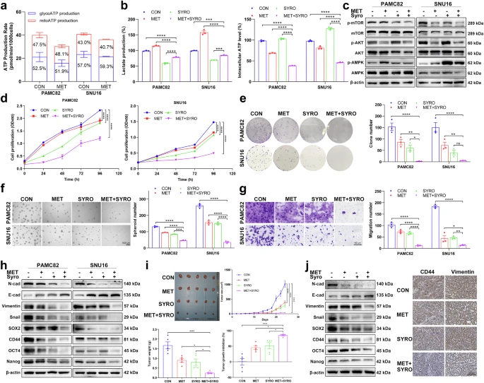 考虑到细胞质ATP和乳酸的协同作用,作者提出同时靶向两种代谢物的联合治疗。鉴于未来临床应用价值,作者选择两种临床相关药物:二甲双胍(MET)和昔洛舍平(SYRO)。不同浓度MET影响细胞内ATP池,检测到细胞内ATP水平下降但乳酸水平无变化。有趣的是,数据还提出了一种新机制,即MET主要通过糖酵解而不是通过线粒体氧化磷酸化来调节ATP的产生(图5a)。此外,SYRO靶向单羧酸转运体(MCTs)破坏肿瘤乳酸稳态后,细胞外乳酸减少;还观察到ATP不明原因增加,但这种增加并不影响药物对PI3K/AKT通路的抑制作用或AMPK通路的激活。
