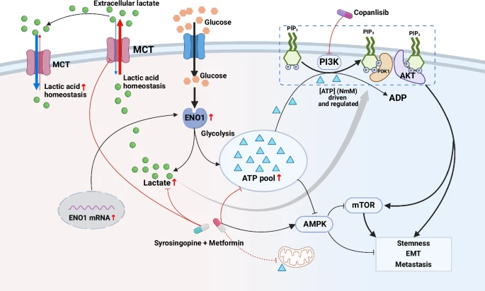 本研究首次系统揭示了糖酵解酶α-烯醇酶(ENO1)通过调控胃癌中糖酵解代谢物的产生和浓度,从而维持肿瘤内恶性信号传导。本文提出了关于癌症代谢综合调控的新见解:ENO1通过增强糖酵解→提升胞内ATP与乳酸水平→ATP直接并协同乳酸激活PI3K/AKT信号、同时抑制AMPK/mTOR信号→最终驱动胃癌干细胞特性与恶性进展。此外,作者通过临床可用药物(MET和SYRO)靶向ENO1-ATP/乳酸-AMPK/PI3K/AKT-mTOR轴上多个节点,为克服传统单一靶点疗法的耐药性问题提供了新的方向,具有明确的临床转化前景。