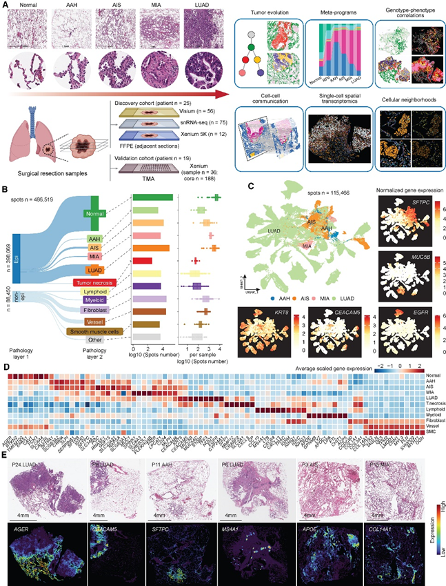 肺腺癌(LUAD)是全球最常见的肺癌组织学亚型。肺癌前体病变,如非典型腺瘤样增生(AAH)和原位腺癌(AIS),为“临床拦截”提供了重要契机。然而,这些病变的生物学特征高度异质,严重限制了临床风险评估及早期治疗决策的精准性。既往研究虽提示肺泡上皮细胞(如 AT2)可能参与癌变,但无法明确 “正常上皮 - 癌前病变 - 侵袭癌” 的连续细胞谱系,也未能解析上皮细胞与免疫微环境的空间互作机制,导致癌前病变的演进规律长期处于 “黑箱” 状态。