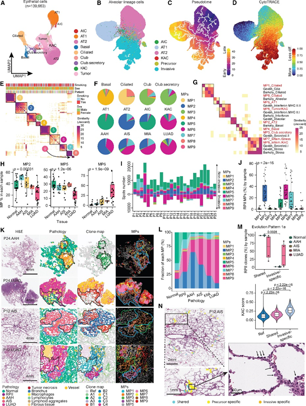 对上皮细胞进行NMF分析,鉴定出9个MPs(图3 E)。将这9个MPs与最近两项泛癌研究关联分析,发现其在谱系(如纤毛)和表型(如炎症/应激)方面均具有很强的相关性(图3G)。MP在正常组织向恶性组织转变过程中表现出动态变化,MP2-AT2和MP5-AT1显著减少,而MP6-肿瘤/KAC则随着病变进展而增加(图3H)。整合snRNA-seq和ST数据并对MP进行空间分析,发现非侵袭性区域(即正常肺组织或癌前病变)显示出较高的MP2和MP7及较低的MP6(图3I)。RPII稀疏分布于病变邻近区域,保留了肺泡特征(MP2-AT2),但共表达 MP6-肿瘤/KAC 和 MP7-炎症/应激(图 3 J)。iStar 发现RPII局限于肺前体病变和侵袭性病变周围,并显示出肺泡空间特有的MPs(MP2)及与病变共享的MPs(如MP6)(图3J和3K)。RPII 常出现在正常组织和癌前病变之间共享克隆的区域(如P24 AAH;图 3K)。这些发现反映了RPII在肺前体病变出现之前就参与了 LUAD 的病理发展。