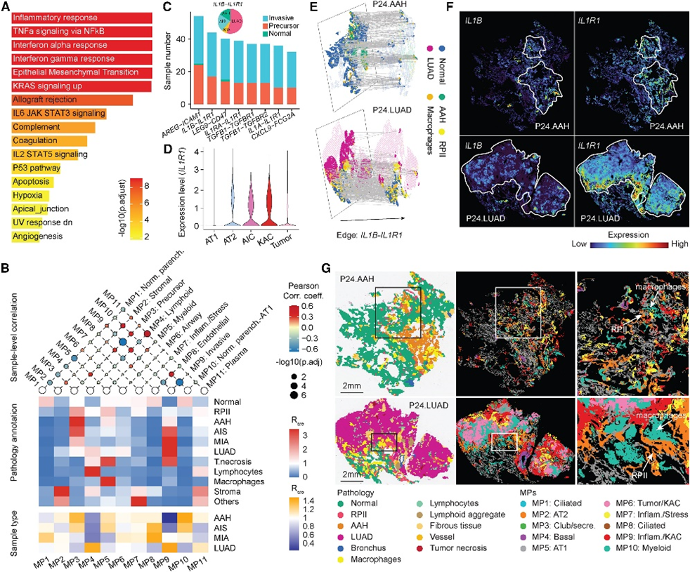 通路分析发现促炎基因在KAC中显著富集(图4A)。将486,519 spots归类为11个MP, 如正常肺泡(MP1和MP10)、髓系(MP5)、肺前体(MP3)和侵袭性(MP9)(图4B)。RPII 和肺前体病变(AAH 和 AIS)与MP3 相关性最强,MIA 和 LUAD 与 MP9 相关性最高(图 4B)。随后分析了 MP 之间的相关性,淋巴样 MP4 与浆细胞 MP11、前体 MP3 与正常肺泡细胞 MP10、前体 MP3 与髓系 MP5均表现出显著正相关。这些发现表明,RPII 和肺前体病变在空间上与髓系细胞亚群紧密相邻。
