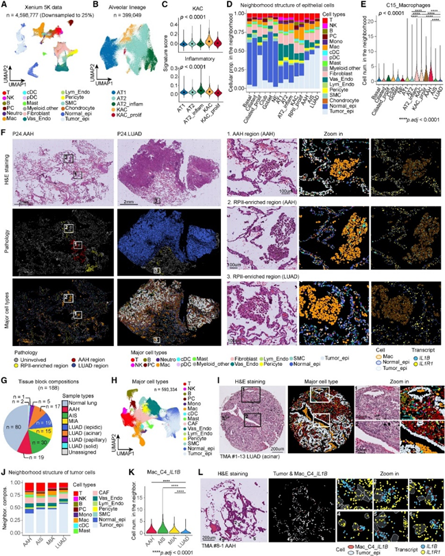 对6对肺前体病变(3例AAH和3例AIS)及配对的浸润性LUAD进行Xenium原位分析(5000+100定制基因)。共获得了4,598,777个细胞,包含上皮细胞、淋巴细胞、髓系细胞、间质细胞和内皮细胞(图5A)。KAC细胞位于AT1和AT2细胞之间,并发现了一个炎症AT2亚簇,其特征是CXCL2和NFKBIA/Z高表达(图5B,5C)。对髓系细胞进行亚群分析,发现了2个IL1B高表达的巨噬细胞亚群(C15和C16)。KAC、AAH和炎症性AT2细胞周围的C15的细胞数量显著更高(图5 E)。KAC簇定位于RPII区域,并与IL1B高表达的巨噬细胞紧密相邻(图5 F)。值得注意的是,AAH也表现出高水平的IL1R1 ,并经常与IL1B高表达的巨噬细胞相邻(图5F)。