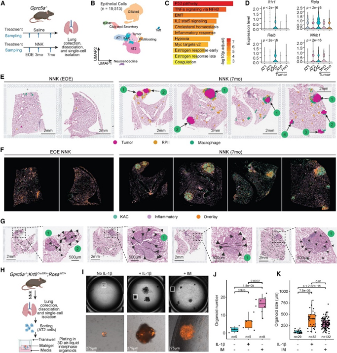 分析了Gprc5a-/-敲除小鼠模型的单细胞转录组数据(图6A),发现肿瘤细胞聚集在肺泡亚群附近,KACs 位于 AT1、AT2 和肿瘤细胞的中心(图 6B)。KACs 显示出炎症相关通路的上调,如NF-κB 介导的 TNFα 信号通路(图 6C)。分析了暴露于NNK的小鼠的肺组织空转数据,发现肿瘤周围始终存在富含巨噬细胞的微环境,RPII大量存在于早期病变周围区域(图6E )。iStar显示KAC和促炎信号同时较高,并共定位于肿瘤区域及周围富含巨噬细胞的微环境中(图6F)。重组IL-1β处理或与小鼠肺巨噬细胞共培养均显著增加了类器官的数量和大小(图6I -6K)。这些发现突显了IL-1β-IL1R1轴和促炎信号在早期肺腺癌发病过程中驱动了KACs的致癌作用。