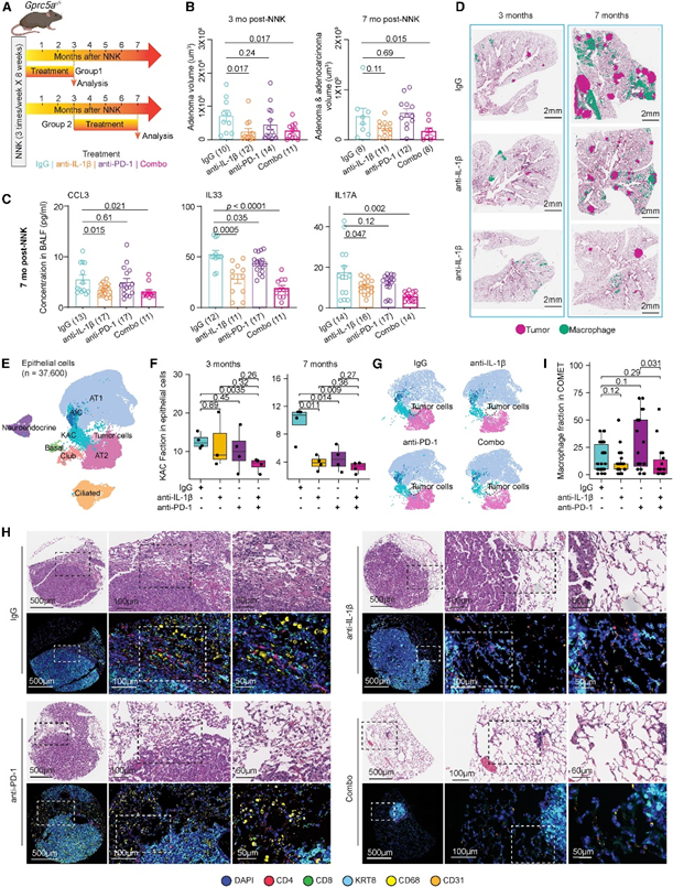 为了探究阻断IL-1β是否能够减少肺泡转化,进而抑制LUAD发病。用IgG、anti-IL-1β、anti-PD-1、联合治疗(anti-IL-1β+ anti-PD-1)分别治疗经NNK处理的Gprc5a-/-小鼠(图7A)。在早期和晚期治疗中,anti-IL-1β治疗更有效;联合治疗(anti-IL-1β+ anti-PD-1)显著增强了肿瘤抑制作用,尤其在早期阶段(图7B)。治疗7个月后,anti-IL-1β治疗显著降低了支气管肺泡灌洗液(BALF)中促肿瘤炎症细胞因子的水平,包括CCL3、IL33和IL17A(图7C)。ST分析进一步表明,anti-IL-1β治疗组小鼠的病灶体积缩小,且病灶周围区域的巨噬细胞浸润减少(图7D)。