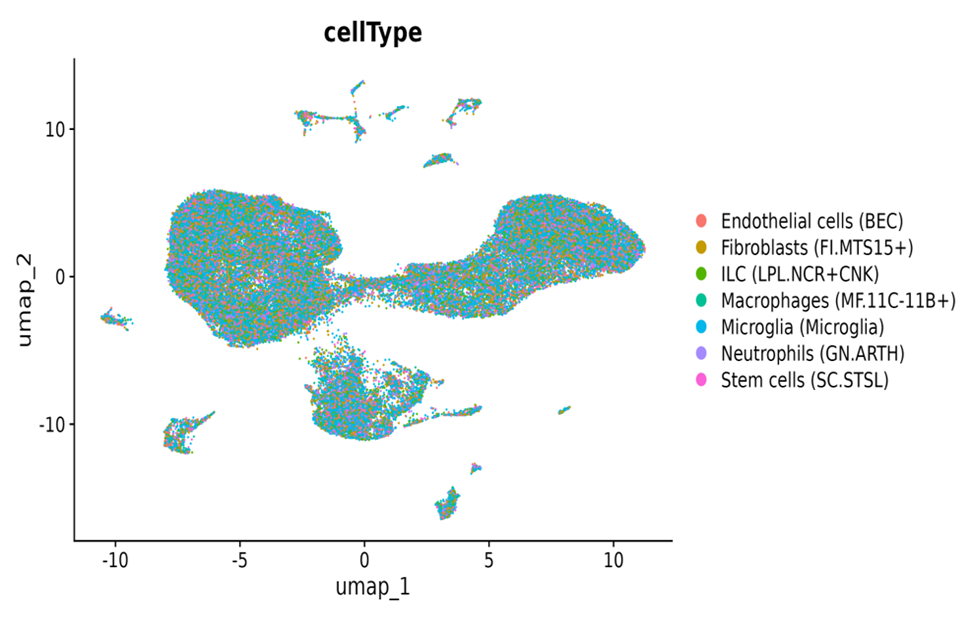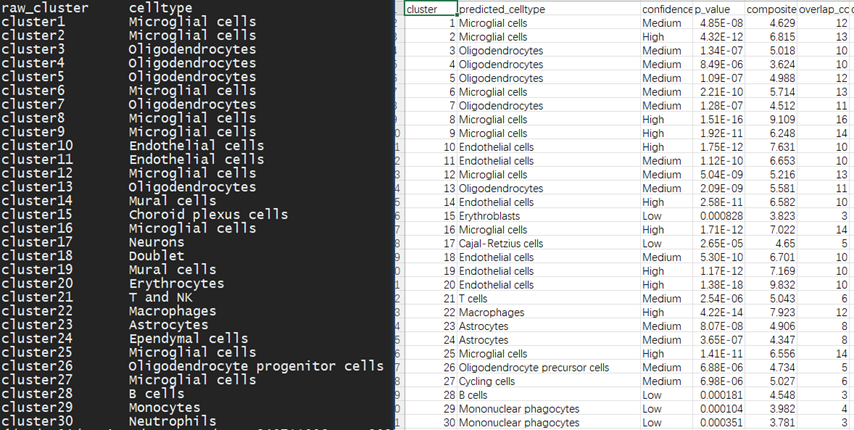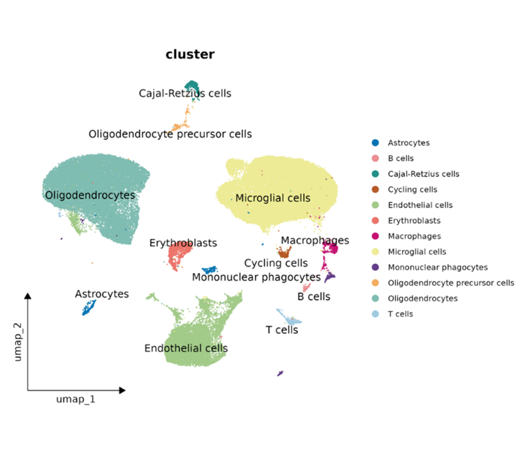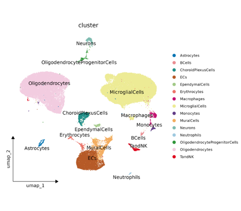 依托内部Marker 数据库与超几何分析相结合的自动化注释方案,精准识别出Microglial cells、Oligodendrocytes、Endothelial cells、T cells、Macrophages、Astrocytes、Oligodendrocytes precursor cells、B cells、Monocytes这些细胞类型,实现了和人工注释相媲美的注释准确度。
